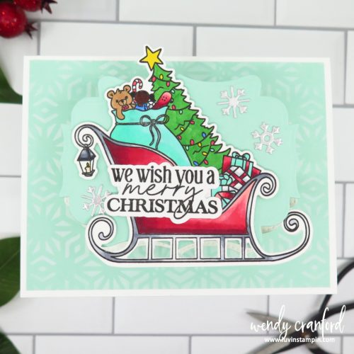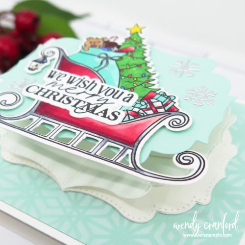 This fabulous Christmas card uses an adorable stamp set called Season’s Gifting from Pajama Crafter Stamps. This was a lot of fun to color and creates a fantastic focal element for your card.